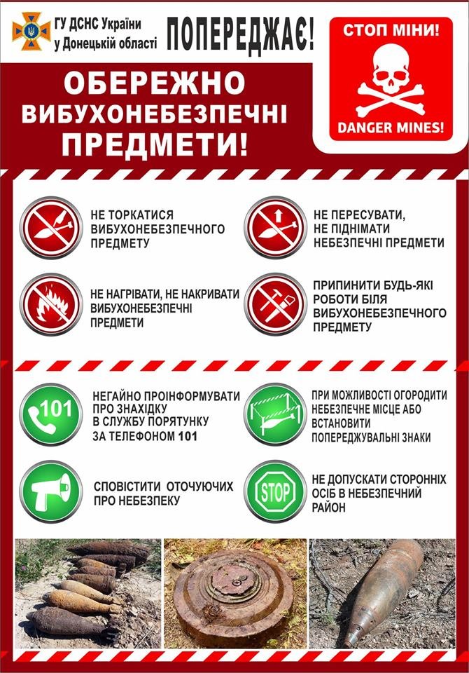 - про знахідку вибухонебезпечного предмета необхідно ТЕРМІНОВО повідомити за номерами телефонів 101 та 102.