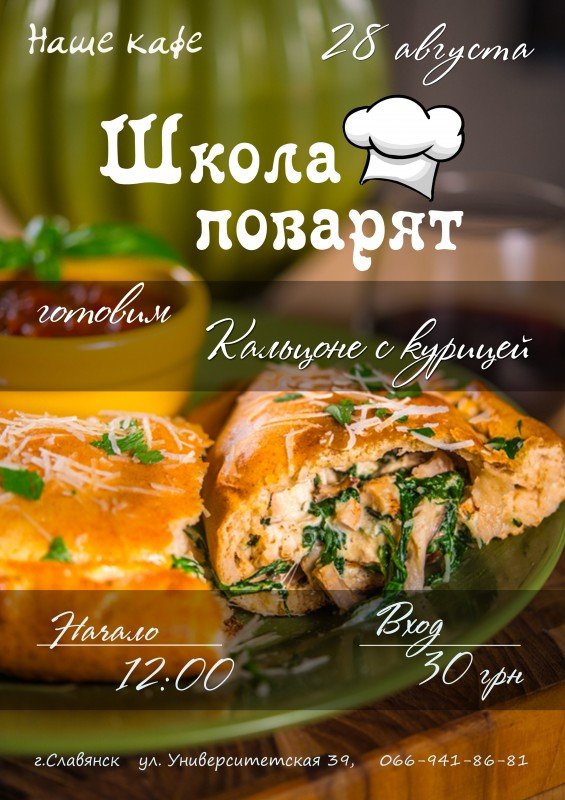 Приглашаем всех посетить школу поварят,которая будет проходить в "Нашем кафе" 28 августа в 12.00.Наша Школа Поварят приглашает маленьких гурманов на мастер-класс по приготовлению кальцоне с курицей. Не пропустите!Справки по тел:+380 (66) 941 86 81