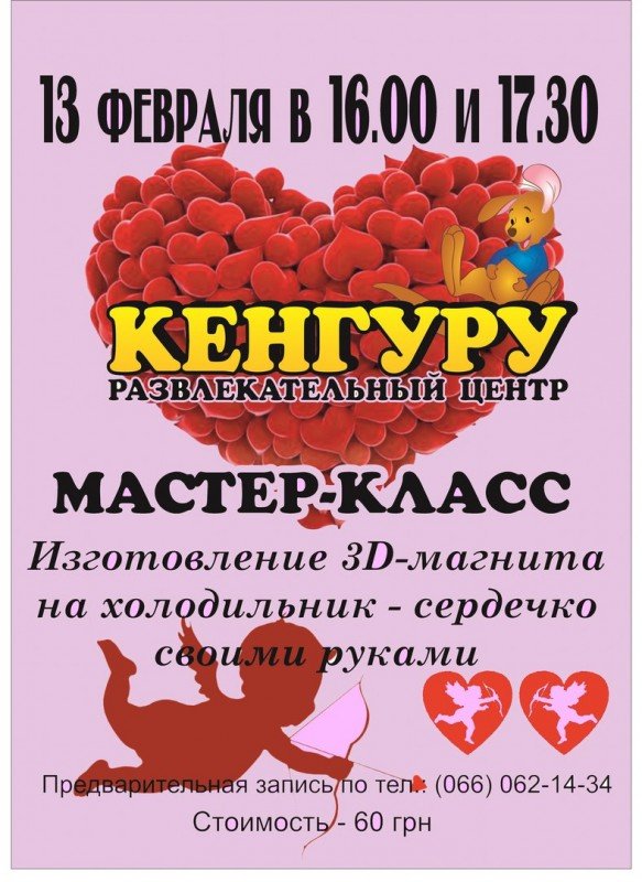 Детский развлекательный комплекс Кенгуру, который находится в самом центре города на площади Соборной,9  (ТД Юбилейный,второй этаж) приглашает Вас на Мастер-класс по изготовлению 3-D магнита на холодильник-сердечко своими руками ! Ждём Вас и Ваших деток!