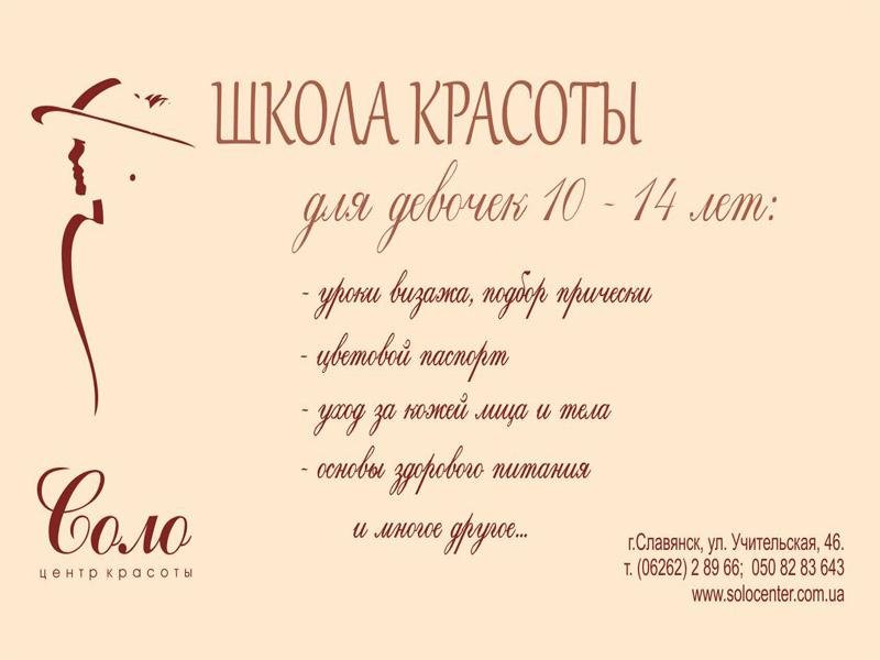 Уважаемые жители г.Славянска и гости города! Центр красоты Соло запускает новый проект - Школу красоты для девочек , которая откроет свои двери для ваших деток с 15 июня 2017г!
