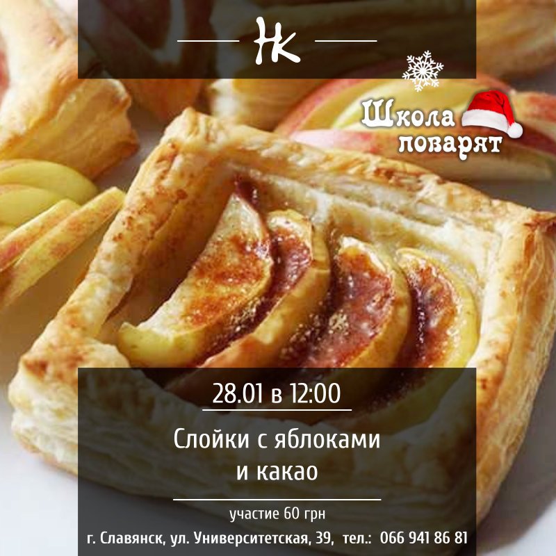 "Школа маленьких поваров" в "Нашем кафе" ждет Вас и ваших деток по адресу: Славянск, ул.Университетеская, 39 на мастер класс по приготовлению слоек с яблоками и какао.