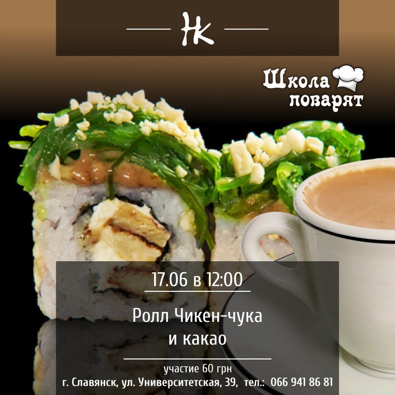 "Школа маленьких поваров" в "Нашем кафе" ждет Вас и ваших деток по адресу: Славянск, ул.Университетеская, 39 на Мастер класс по приготовлению ролла Чикен-чука и какао!