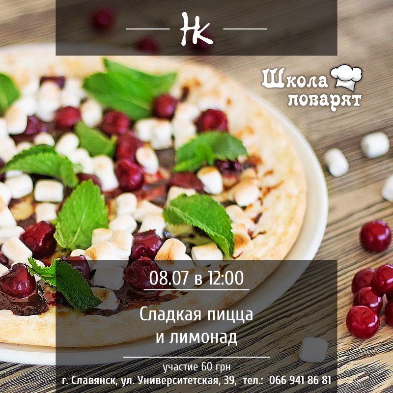 "Школа маленьких поваров" в "Нашем кафе" ждет Вас и ваших деток по адресу: Славянск, ул.Университетеская, 39 на мастер класс по приготовлению сладкой пиццы и лимонада!