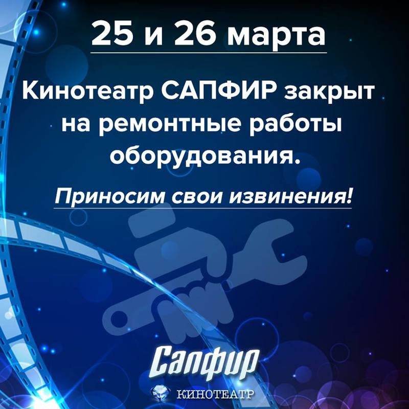Кинотеатр Сапфир закрыт на ремонтные работы оборудования (25 и 26 марта)