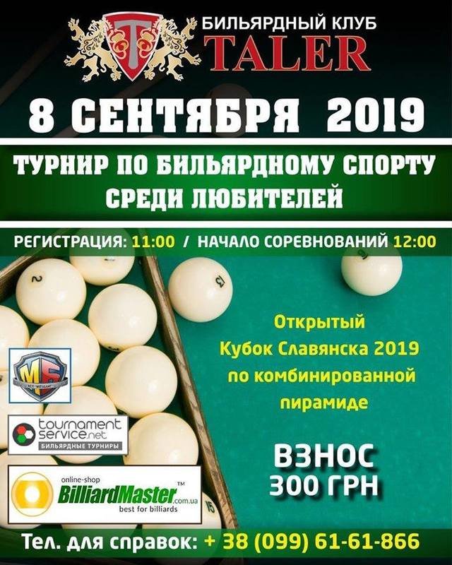 «Открытый Кубок Славянска 2019 по комбинированной пирамиде» В бильярдном клубе РЦ «Taler» 8 сентября пройдет турнир по бильярдному спорту среди любителей. Регистрация на турнир 8 сентября в 11:00. Начало соревнований в 12:00. Взнос – 300 грн. Телефон для справок: +38(099)61-61-866