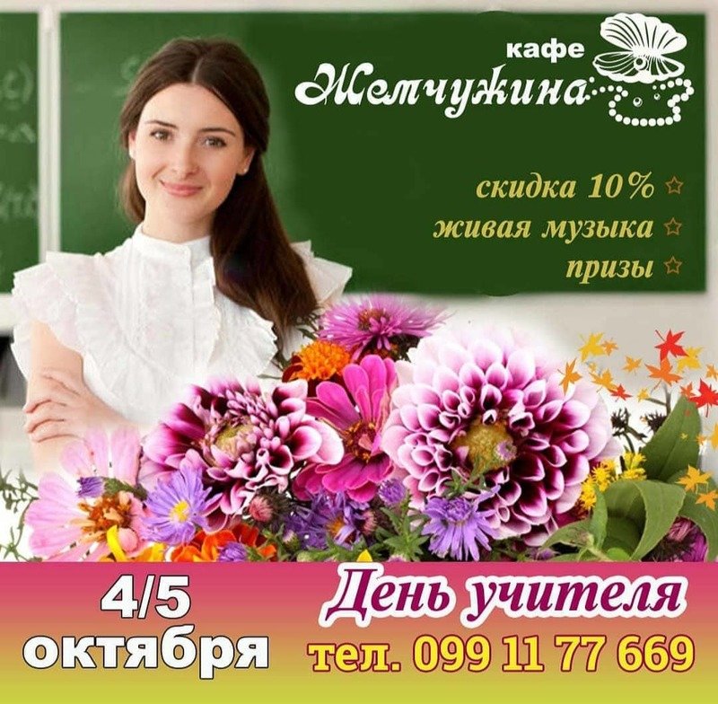 Мы с теплотой и благодарностью вспоминаем своих учителей - внимательных и строгих, помогавших нам постигать знания и жизненную мудрость. Выражаем Вам, дорогие учителя, глубокую признательность и предлагаем отметить 4 и 5 октября, свой профессиональный праздник, в кафе "Жемчужина"!