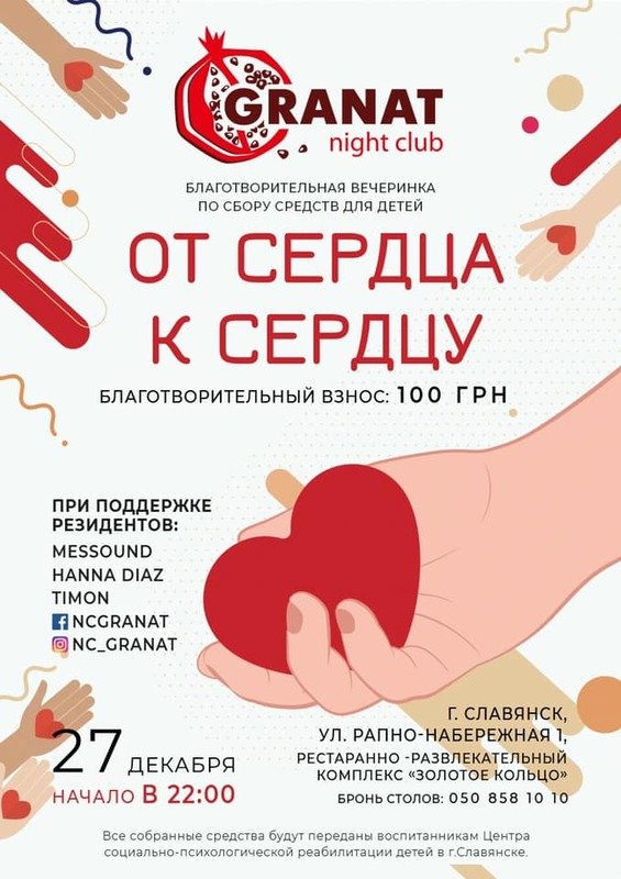 27 декабря в 22:00 ночной клуб «Granat» при поддержке ресторанно - развлекательного комплекса «Золотое кольцо» проводит Благотворительную вечеринку «От Сердца к Сердцу» по сбору средств для детей Славянского центра социально- психологической реабилитации детей, находящегося по адресу: 84122, Донецкая обл., Славянск, ул. Короленка, дом 3.