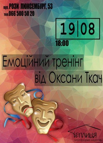 19.08 (середа ) / 18:00 –Емоційний тренінг від Оксани Ткач. «Почуття заховані в відчуття, а емоції є їх прояв»,-Айшек Норам