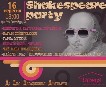 16.09/18:00 - Shakespeare party. В програмі вечора: невеличка театральна постановка , багато спілкування, гарна музика, шекспірівські читання, майстер клас "Виготовлення кексу для коханих за 3 хв", чай-кава- потанцюймо. Вечірка до Дня Народження Джульєти