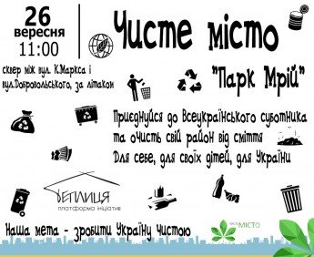 26.09/11:00 –Чисте місто. "Парк Мрій",сквер між вул. К.Маркса і вул.Добровольського, за літаком. Приєднуйся до Всеукраїнського суботника та очисть свій район від сміття. Для себе, для своїх дітей, для України. Наша мета - зробити Україну чистою. http://musor.net.ua/#header