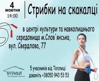 04.10/ 14:00 – приймаємо участь у змаганнях «Стрибки на скакалці», від Теплиці збираємо команду з 5 людей, телефонуй 050 943 53 53