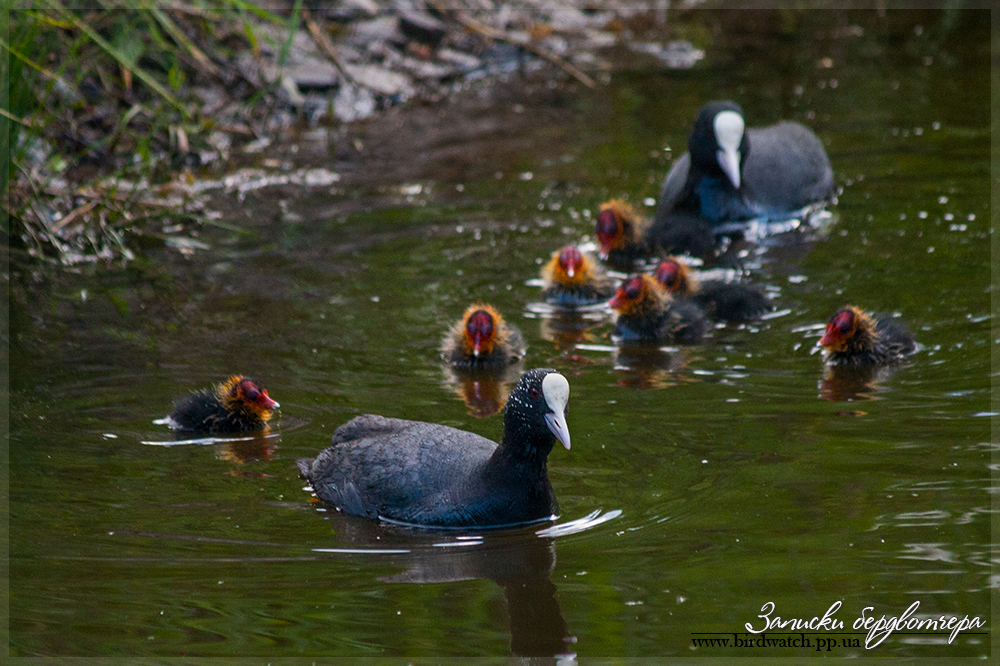 Фотоохоту продолжил, когда шел уже домой. На озере Лиман (на САТУ), возле мостика, ведущего на Колыбу, встретил лысуху с птенцами.