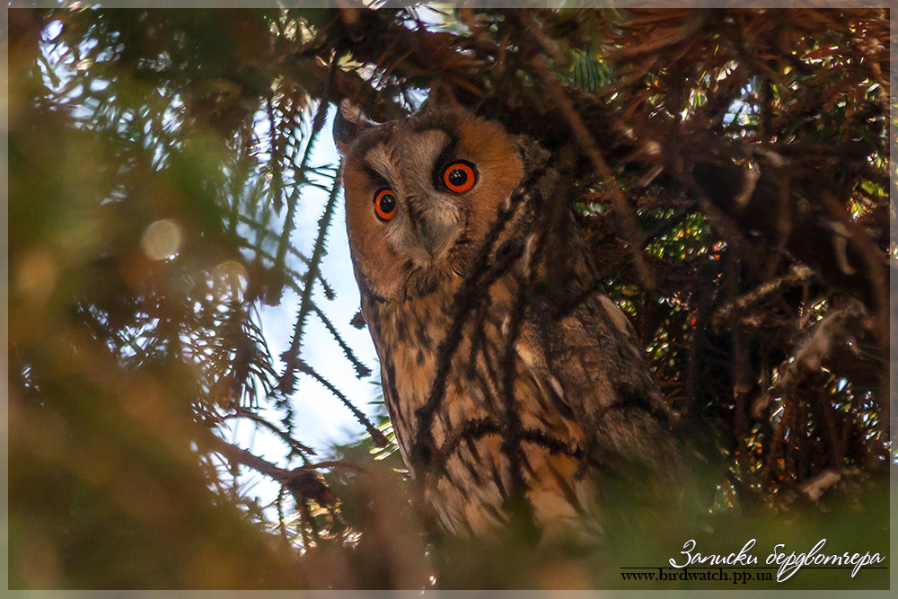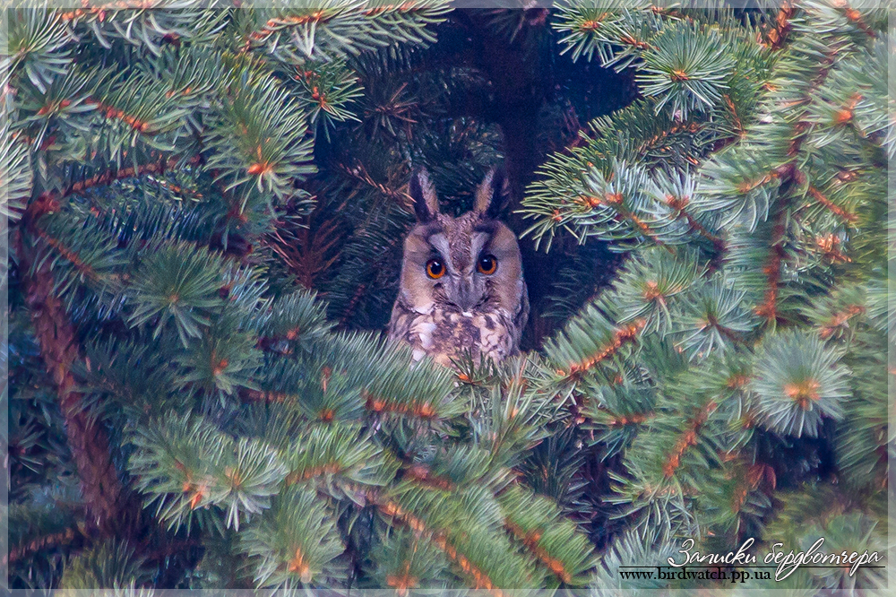 Гораздо интересней было проверить прошлогоднее место зимовки сов. И хотя серьезные заморозки еще впереди, первые постояльцы уже заняли свои места. Среди густых веток хвои можно разглядеть сонные мордахи ушастых сов.