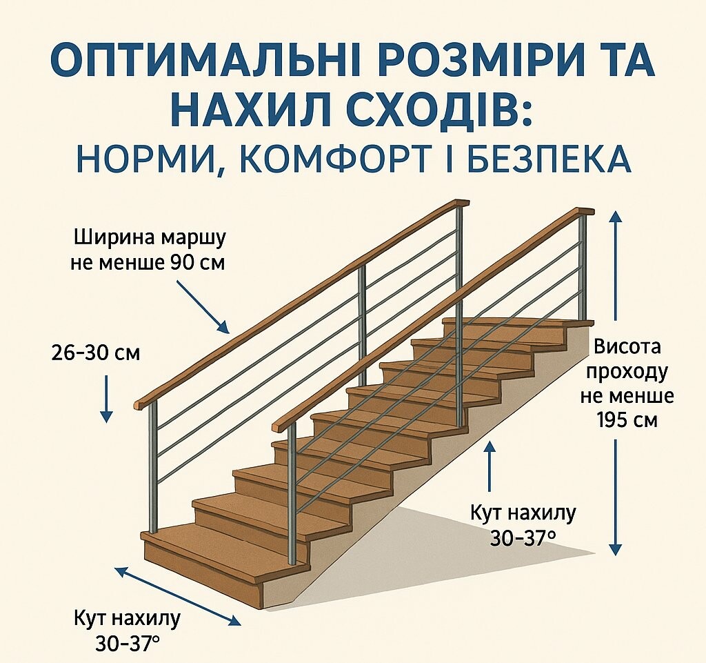 Нахил маршу впливає на те, як легко ваші ноги «розумітимуть» сходи. Ідеальним вважається кут 30–37° — це природний компроміс між компактністю та зручністю. При меншому куті сходи займають багато місця, при більшому — стають небезпечними, особливо для дітей та людей старшого віку.