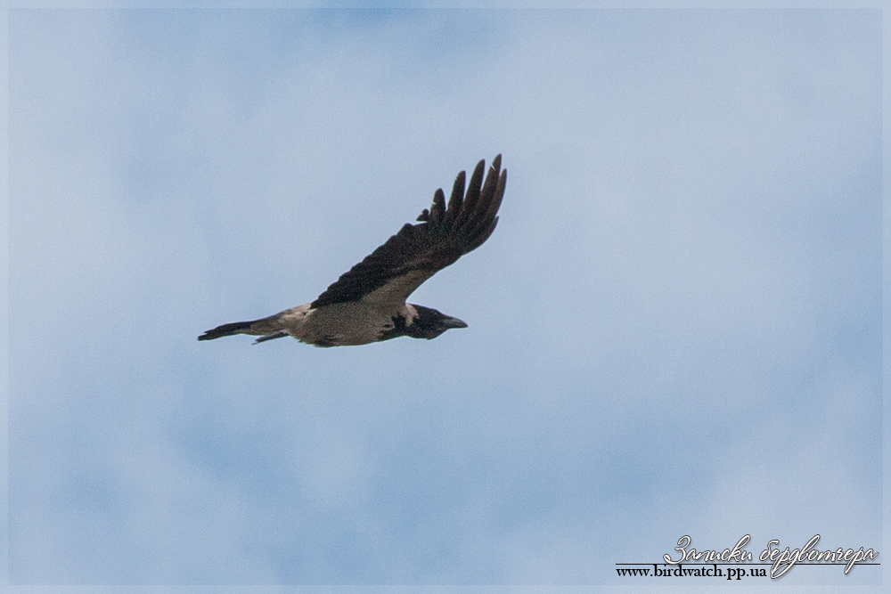 В небе кружила серая ворона, видимо высматривала оставленное без присмотра гнездо, чтоб утянуть яйцо.