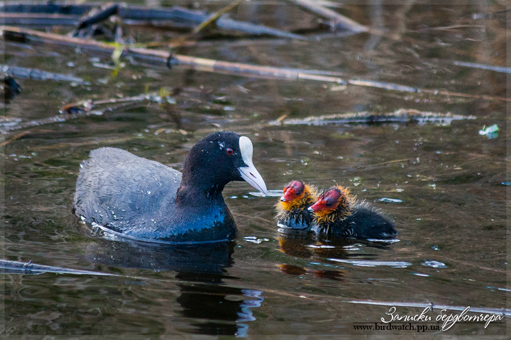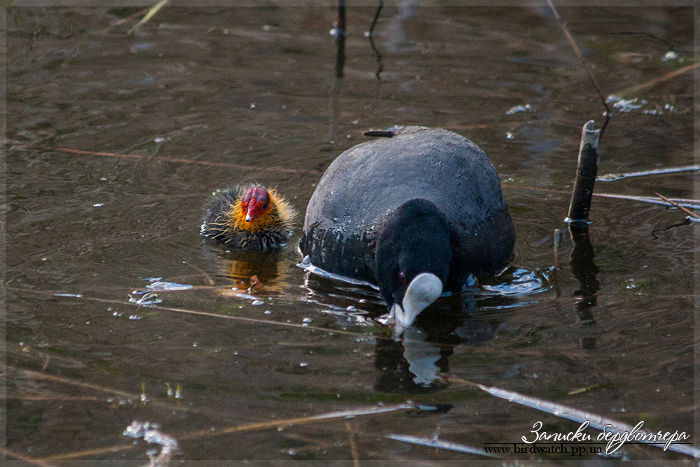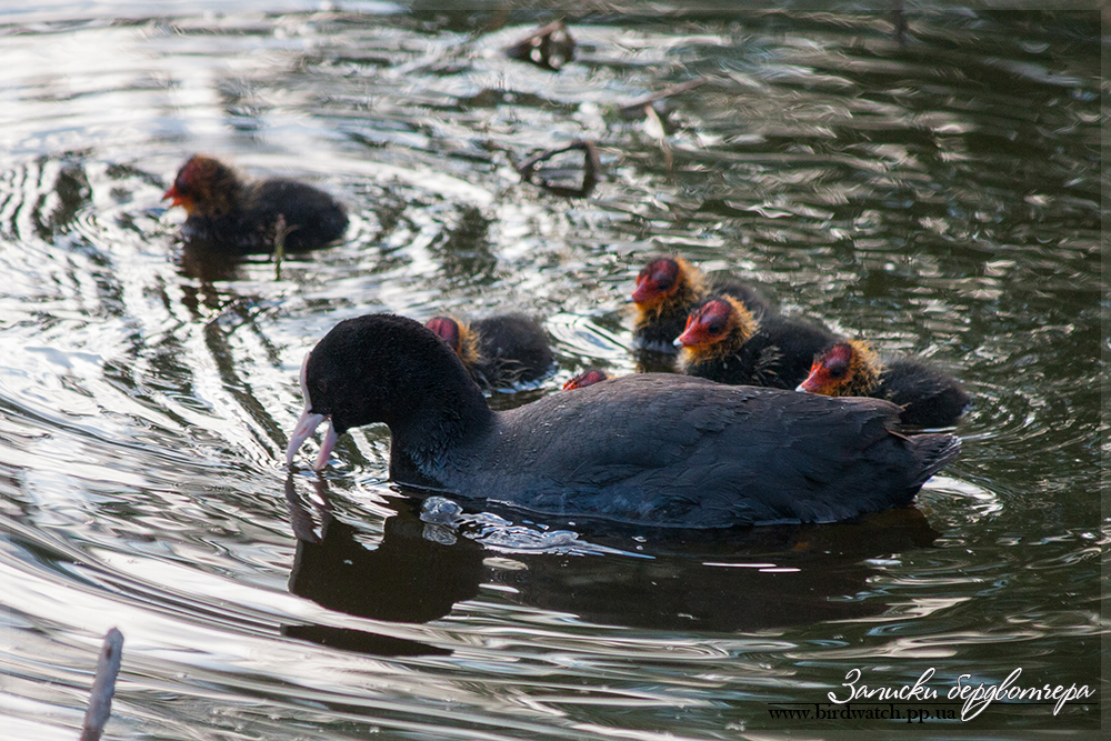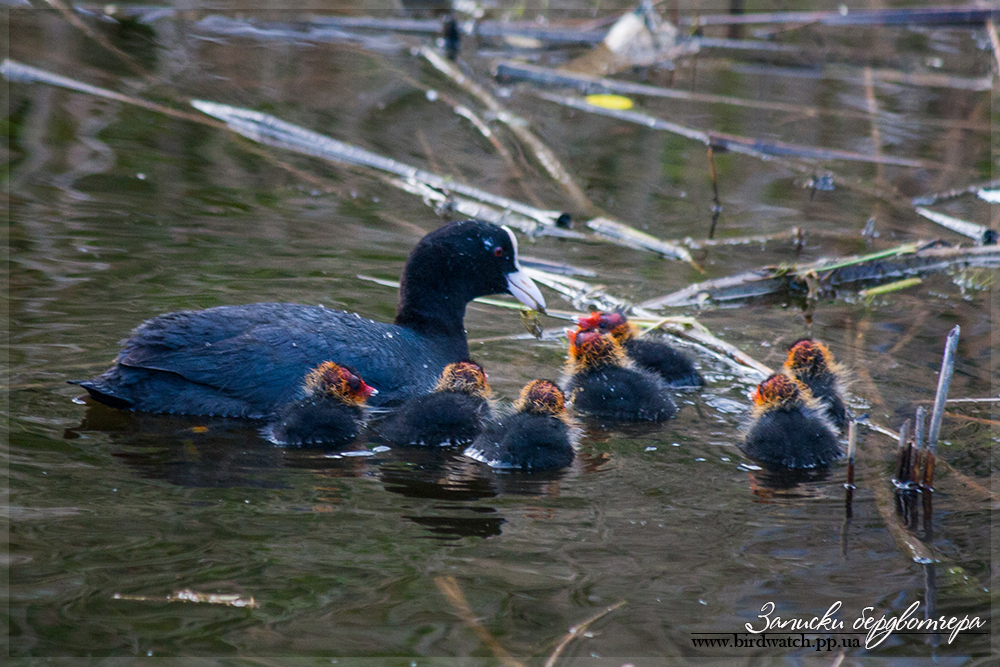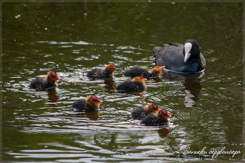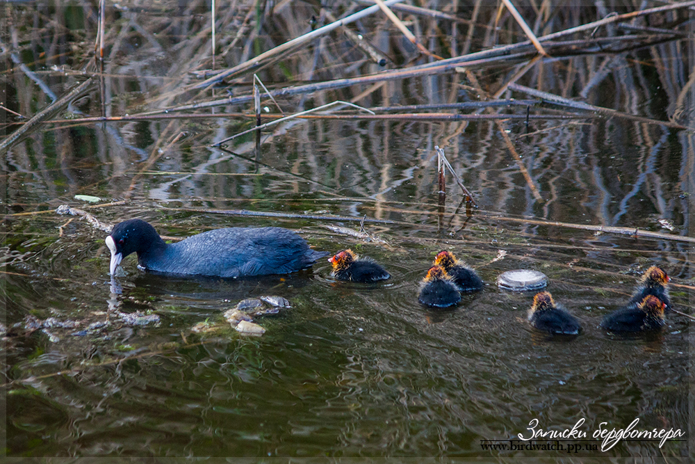 Фотоохоту продолжил, когда шел уже домой. На озере Лиман (на САТУ), возле мостика, ведущего на Колыбу, встретил лысуху с птенцами.