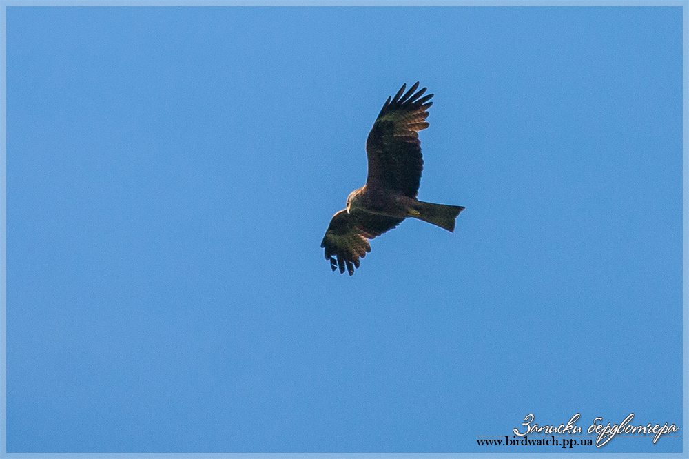 Высоко над полями, высматривая добычу, парил черный коршун.рус. Черный коршун, укр. Шуліка чорний, лат.Milvus migrans.