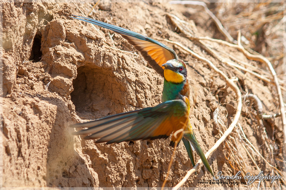 Их довольно сложно сфотографировать, ведь стоит одной птице тебя увидеть и сразу улетают все. В этот раз было так же. Но подходя к обрыву, заметил, что одна из птиц вылетала из норы. А это означало, что даже если и улетят, то через время вернутся к своим норам.Выбрав место где было бы удобно снимать, я лег, укрывшись затеняющей сеткой зеленого цвета (покупая ее на рынке, было сложно объяснить продавцу, для чего она мне нужна) и стал ждать. Спустя примерно пол часа, стали прилетать первые щурки. Осторожничали, садились на дерево, что на краю обрыва и осматривались. Иногда, с громкими криками, пролетали прямо у меня над головой. Через время они немного успокоились и вот уже первая щурка прилетела с добычей в клюве.рус. Золотистая щурка (пчелоедка), укр. Бджолоїдка звичайна, лат.Merops apiaster.