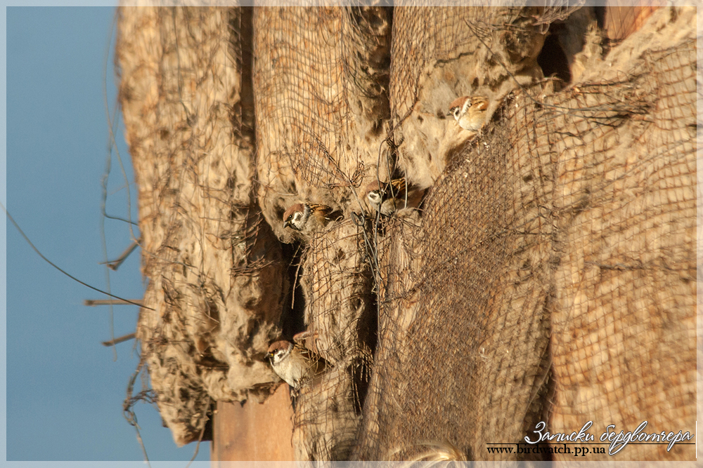 Воробьи, чувствуя приближающийся холод, облюбовали стекловату на старой емкости, видимо использовавшейся сользаводом для закачки рапы.укр. Горобець польовий. лат. Passer montanus. рус. Полевой воробей.