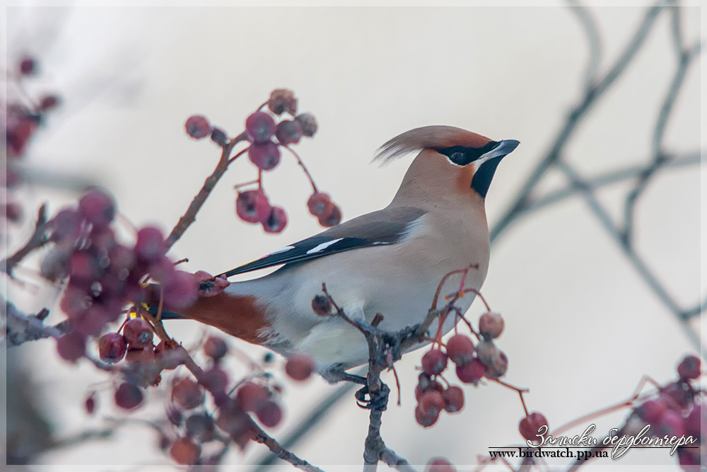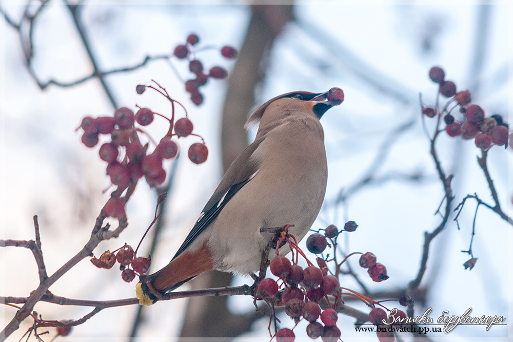 Но эти птички встречаются часто, ничего необычного, потому уже собирался идти обратно. Вдруг заметил среди деревьев стайку птиц, размером как дрозд, первым делом подумал о рябинниках. Перешел дорогу и был очень приятно удивлен, на деревьях, как яркие новогодние игрушки, сидели свиристели.рус. Обыкновенная свиристель, укр. Омелюх звичайний, лат. Bombycilla garrulus.