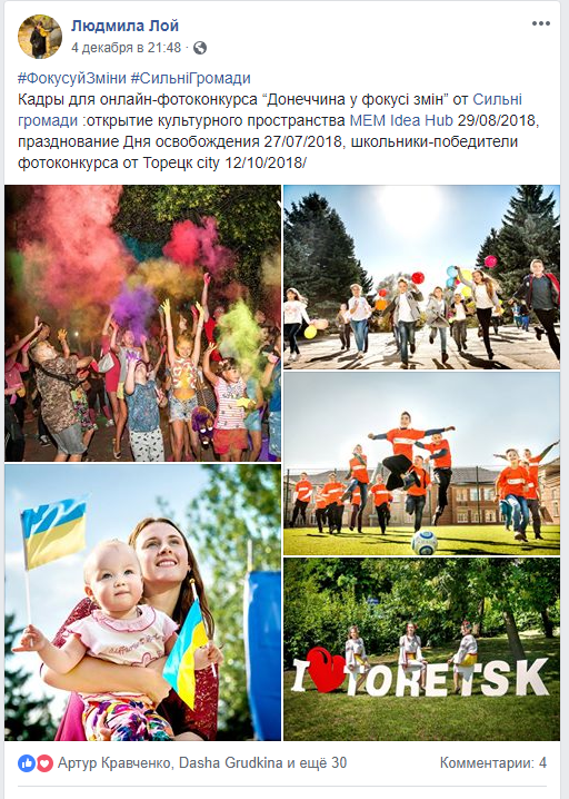 Учасниця фотоконкурсу з Торецька Людмила Лой опублікувала фотографії з відкриття молодіжного простору МЕМ Idea Hub та святкування Дня звільнення міста від підконтрольних Російській Федерації незаконних збройних формувань.