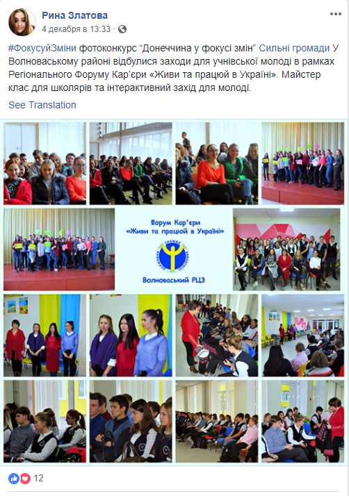 Мешканка Волноваського району Рина Златова надіслала на конкурс фото з заходів для учнів, які відбулися в рамках Регіонального Форуму Кар’єри “Живи та працюй в Україні”.