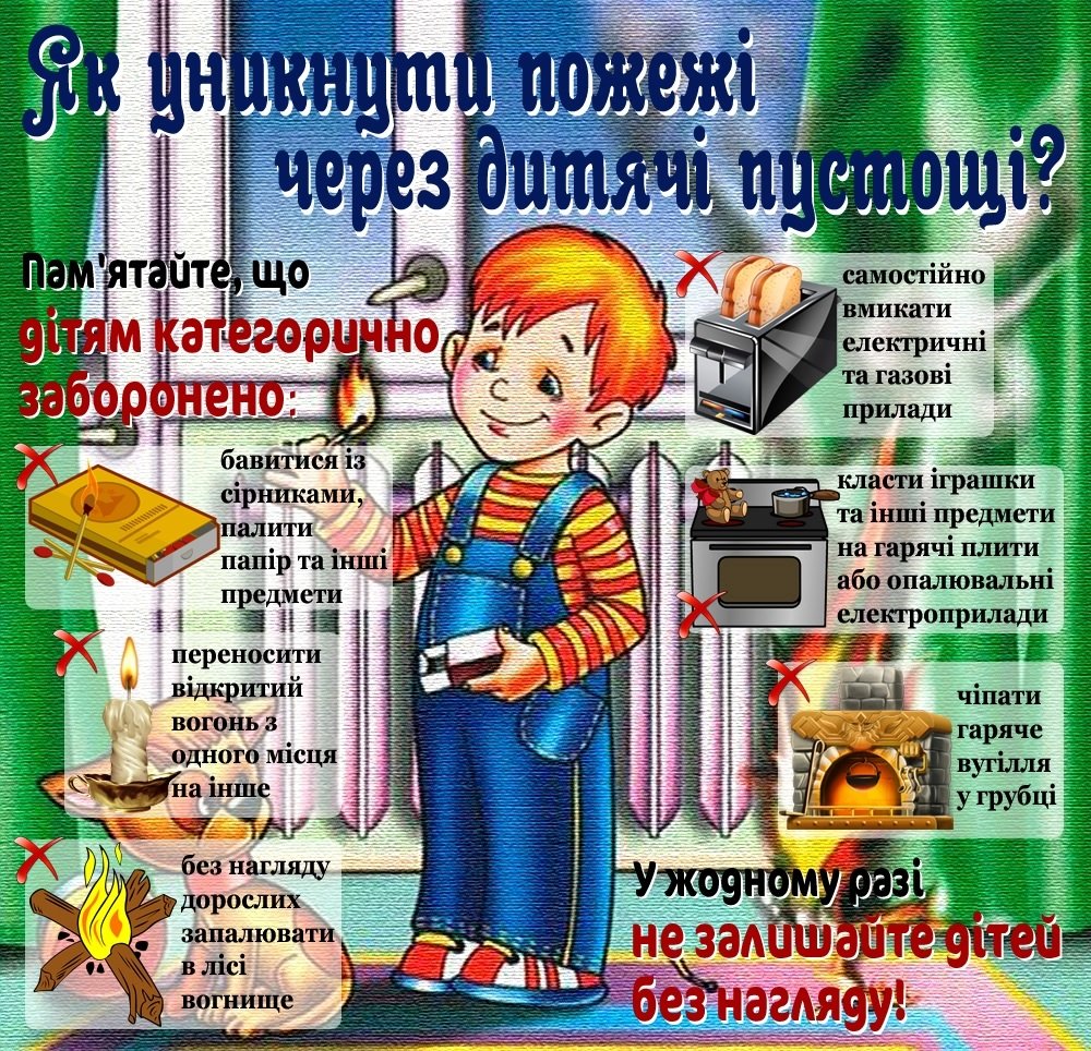 На жаль, батьки в повсякденних турботах у більшості випадків не приділяють достатньої уваги та часу вихованню у дітей обережного поводження з вогнем, часто залишають їх без нагляду, що не рідко призводить до виникнення пожежі внаслідок дитячих пустощів з вогнем.