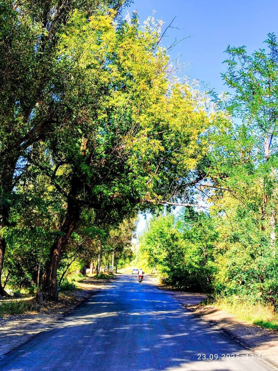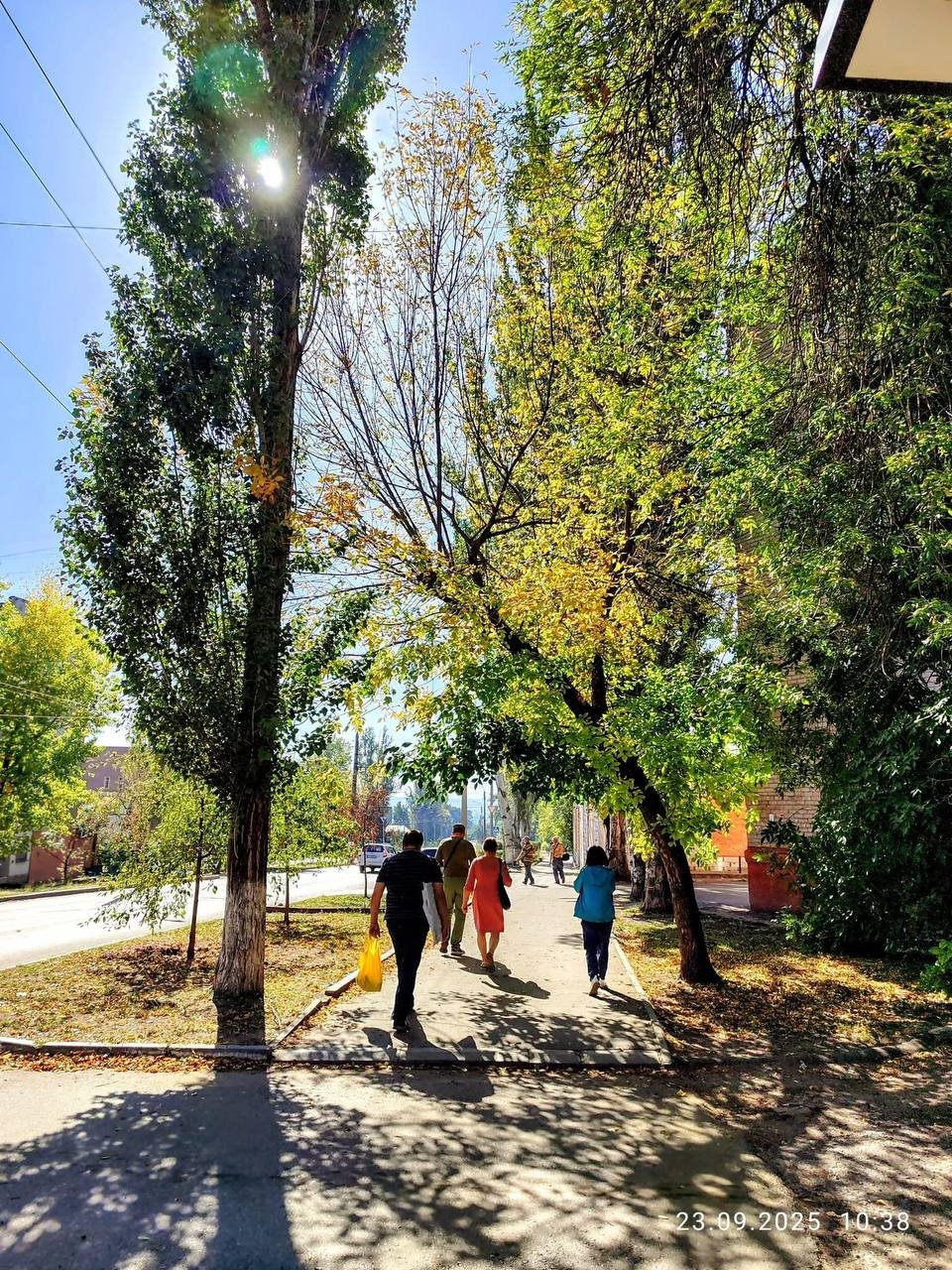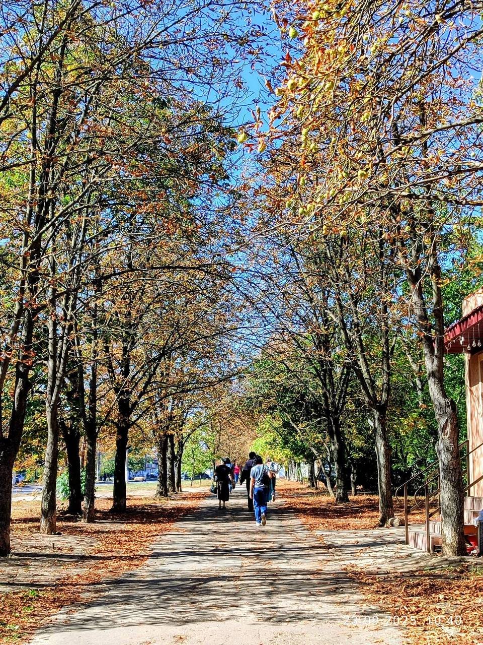 Перехожі користуються останніми теплими днями: прогулюються, фотографують барви сезону, на дорогах — спокійний рух.
