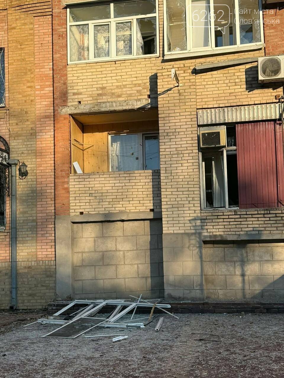Дрон влучив у центральну частину Словʼянська. Постраждав багатоповерховий будинок за адресою вулиця Центральна, 38. Внаслідок влучання у будівлі вибило вікна.