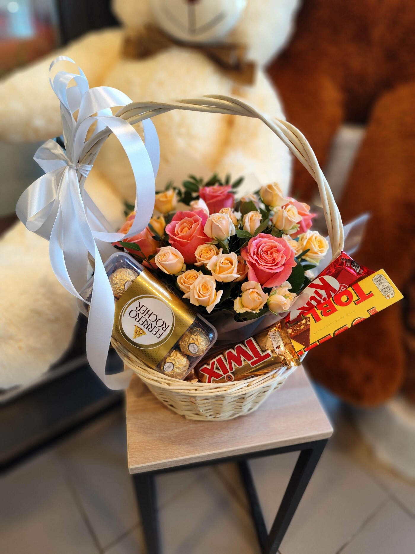 Один із найпопулярніших варіантів — кошик із червоними трояндами та бельгійським шоколадом. Такий подарунок виглядає розкішно і водночас дуже романтично, особливо якщо доповнити його вітальною листівкою.