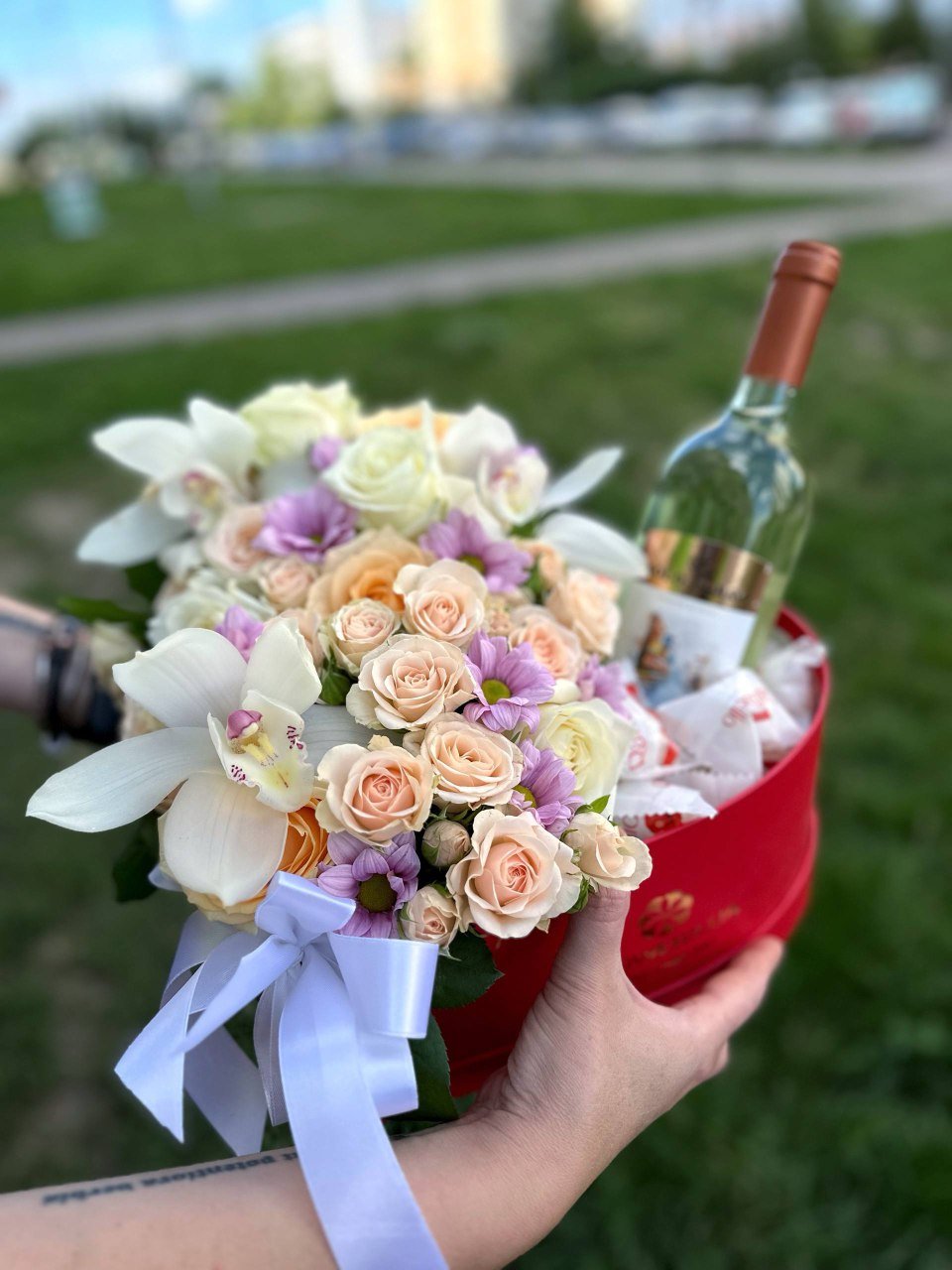 Композиція «Монако» — це символ вишуканості й розкоші. Її серце — це поєднання кремових троянд, білої орхідеї, рожевої хризантеми ромашкової та цукерок.
