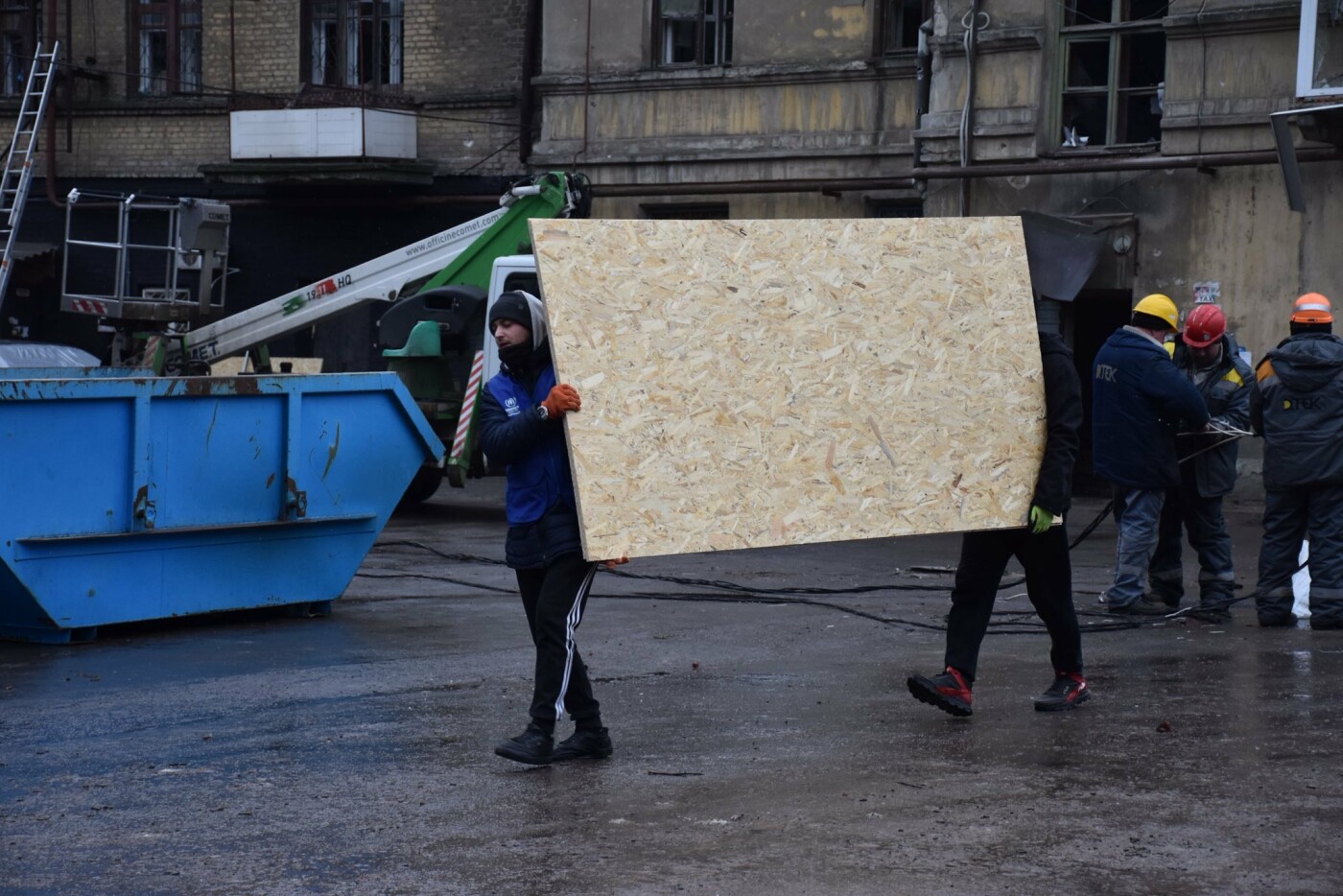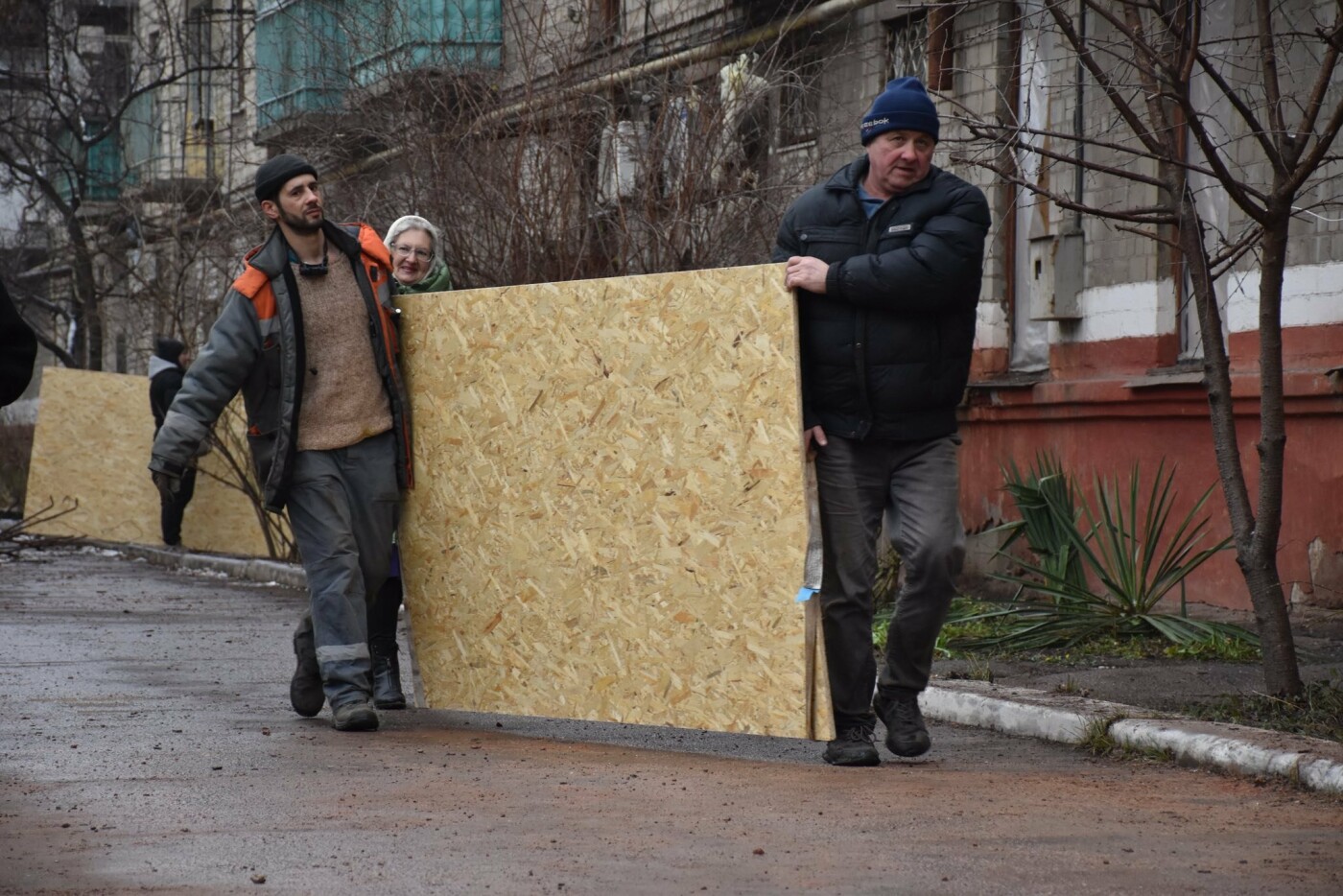 Благодійна організація "Янголи спасіння" за координації управління з питань цивільного захисту передає людям ДСП для тимчасового закриття вибитих вікон та дверей.