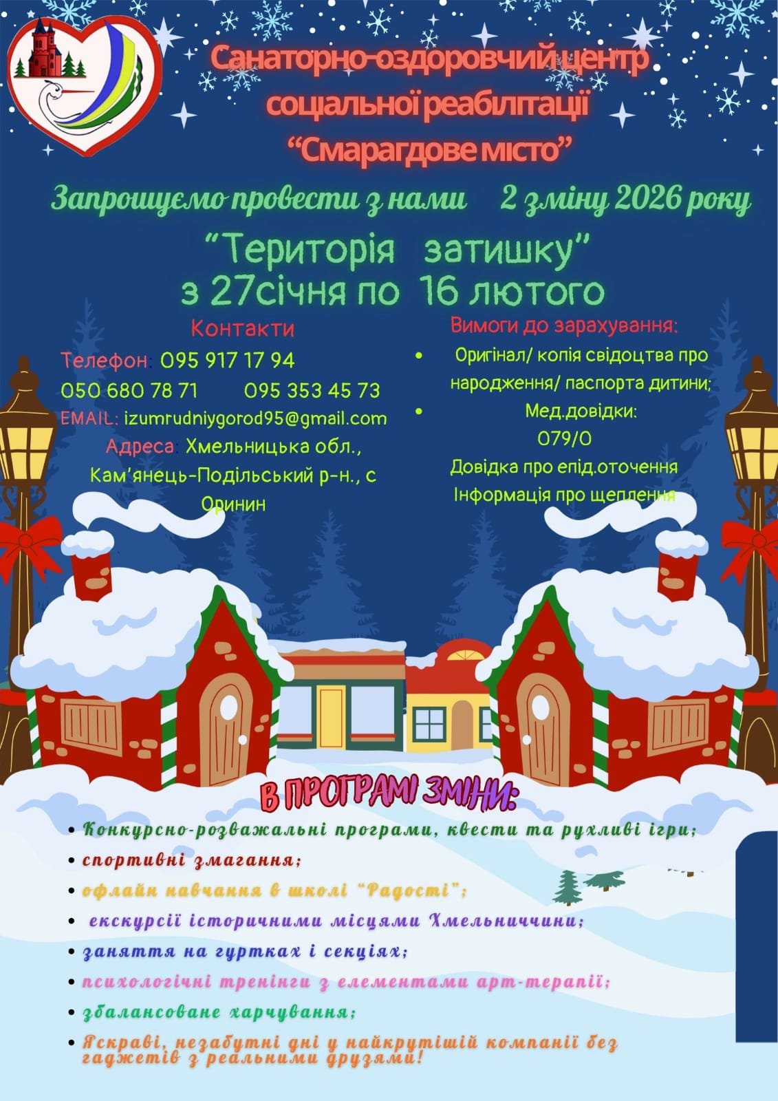 Дітей Донецької області віком від 6 до 17 років запрошують до санаторно-оздоровчого центру соціальної реабілітації "Смарагдове місто". Пропонують провести разом 2 зміну 2026 року "Територія затишку", яка триватиме з 27 січня по 16 лютого.