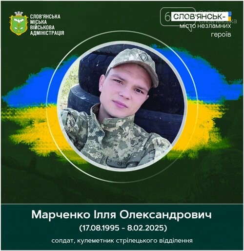 У Слов'янську поховали солдата Іллю Олександровича Марченка, який загинув під час виконання бойового завдання. Про це повідомляє "Меморіал Слов'янської територіальної громади".