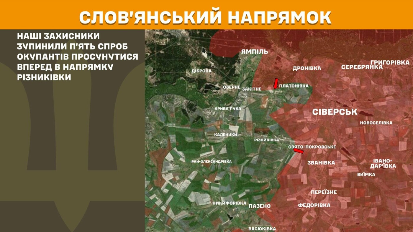 Противник шість разів атакував позиції українських військ. Основні удари — в районах Греківки та Зарічного. Також росіяни наступали в бік Ставок, Діброви, Нового Миру й Лиману. Вклинитися в українську оборону не вдалося.