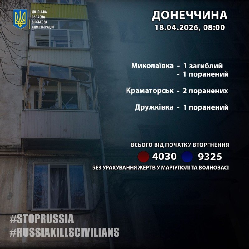 За даними Донецької обласної військової адміністрації, 17 квітня внаслідок російських атак на Донеччині загинула одна людина та зазнали поранень четверо.