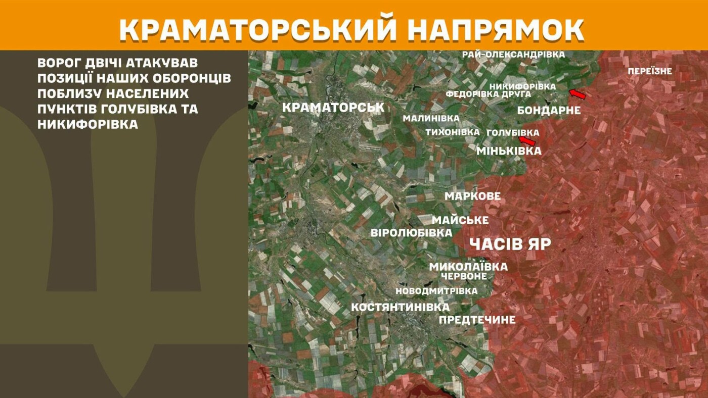 На Краматорському напрямку ворог двічі атакував позиції оборонців. Удари завдавали поблизу населених пунктів Голубівка та Никифорівка.